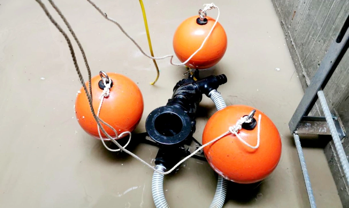 Máy bơm được giữ nổi trên mặt nước nhờ 3 phao, miệng hút có thể điều chỉnh độ sâu từ 0 – 60mm, đảm bảo hút sạch váng bọt và dầu mỡ ngay cả khi mực nước thay đổi.